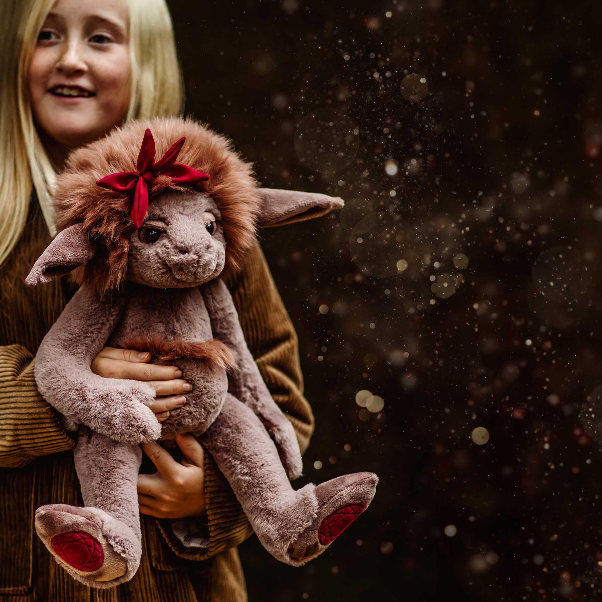 Ruby’s bright, friendly smile and distinctive pointy ears give her the look of a storybook creature brought to life. Her brown plush fur is irresistibly soft, paired with a thick, fluffy mane that’s impossible to resist. Deep ruby-coloured embroidered gemstone paw pads add a striking magical detail. With her squishy, non-jointed design, Ruby is perfect for cuddling, relaxing, or simply keeping a comforting presence nearby.