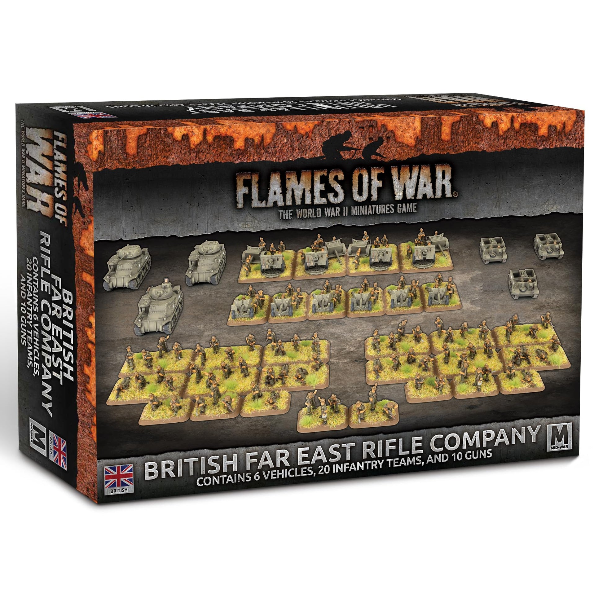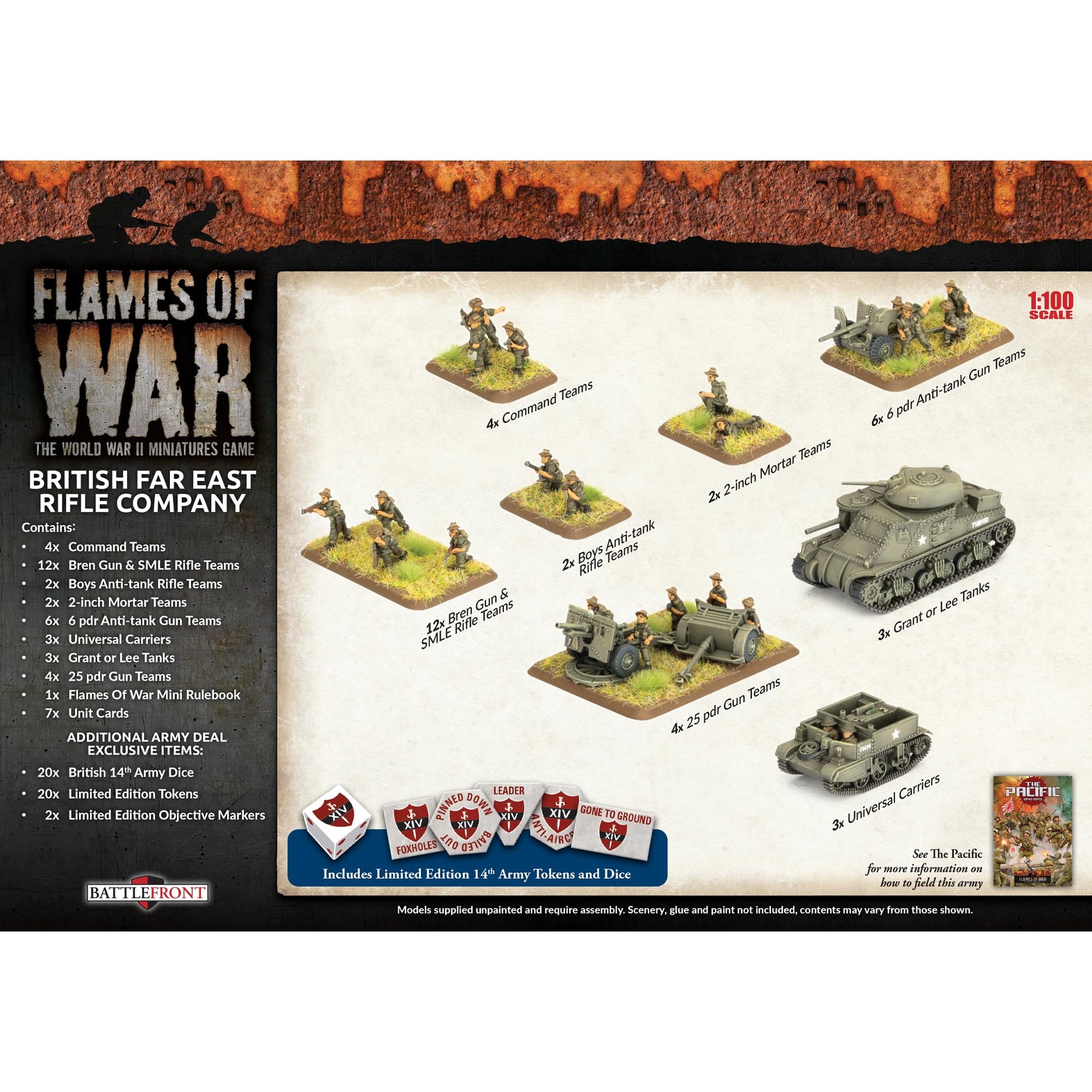 This British Rifle Company is the perfect starting point for your British Forces in The Pacific. Containing 2 full Rifle platoons with full support, along with Universal Carriers, Grant Tanks 6 pdr and 25 pdr gun teams. Also includes unit cards and limited Edition 14th Army tokens and Dice. Safety Warning No Warning Applicable