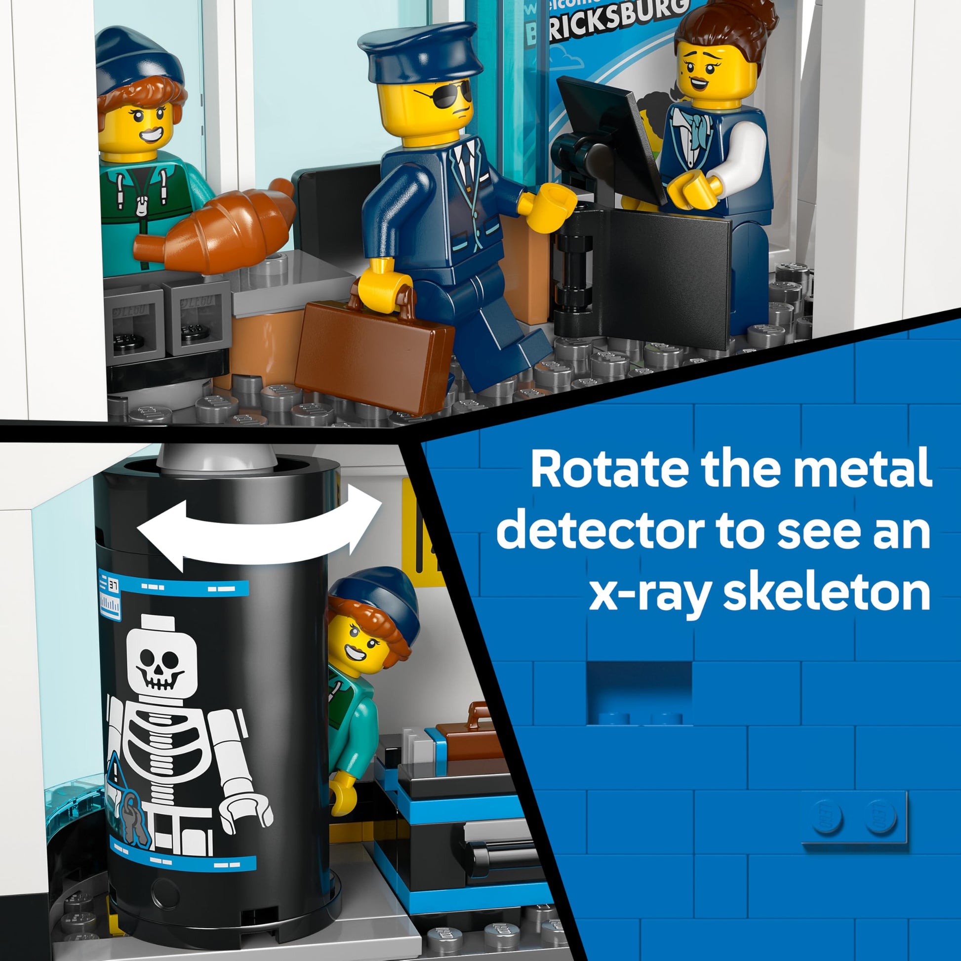 Playtime will take flight with the LEGO® City Airport with Airplane (60502) building kit for kids ages 8 and up. This detailed model airport is packed with features for pretend play. Kids can pass luggage through the toy scanner, rotate the walk-through metal detector to reveal an X-ray skeleton and change the departure display to offer a choice of 4 destinations. The set also includes a cool toy passenger airplane with a detailed cabin and fold-down stairs, plus an airport tug and a jet bridge. Just add the 9 minifigures for hours of imaginative play. This airport toy makes a great gift idea for boys, girls and kids who love model airplanes and LEGO building sets. Add it to other sets (sold separately) from the LEGO City range for even bigger adventures. Team up with friends and family with Build Together mode in the LEGO Builder app, where everyone has fun building part of the set using their own devices. Set contains 887 pieces.